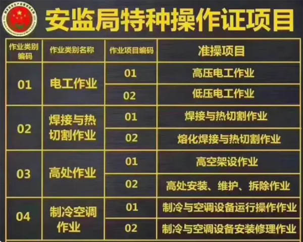 應急管理部特種作業(yè)操作證包含工種及作業(yè)范圍